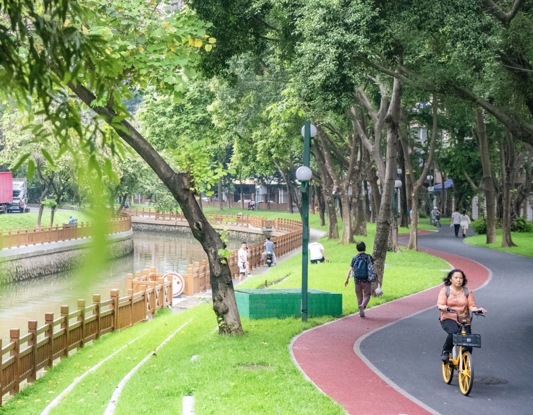 驷马涌流经荔湾彩虹街、南源街两个人口密集的片区,老城区居民对宽敞、新净公共空间有迫切需求。整治工程将灌木杂乱、人车混行、高低错落、空间狭小、居民亲水活跃度并不高的驷马涌两岸,改造为疏林草地、视野开阔、人车分流、动线连贯、空间舒适安全的高质量滨水空间,最大限度满足群众交通出行、运动休闲、游憩娱乐的生活需求。