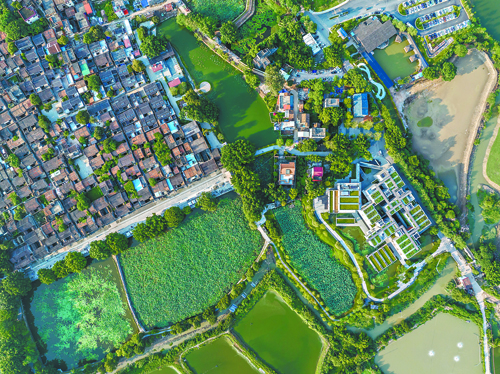 站在村口一棵古榕下放眼看去,古村东南角荷塘畔的全新多功能艺术文化中心——春阳台又是一道特别的风景。春阳台由著名建筑师张永和设计,采用红瓦、青砖和素混凝土为材,以塱头古村“梳式街巷”为灵感设计步道,并在屋顶建有25个荷塘,与古村荷塘共同构成“立体荷塘”。这座独具匠心的建筑自今年4月20日向公众开放后,很快就成了古村新的打卡点。