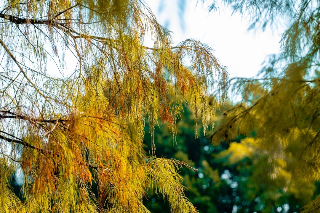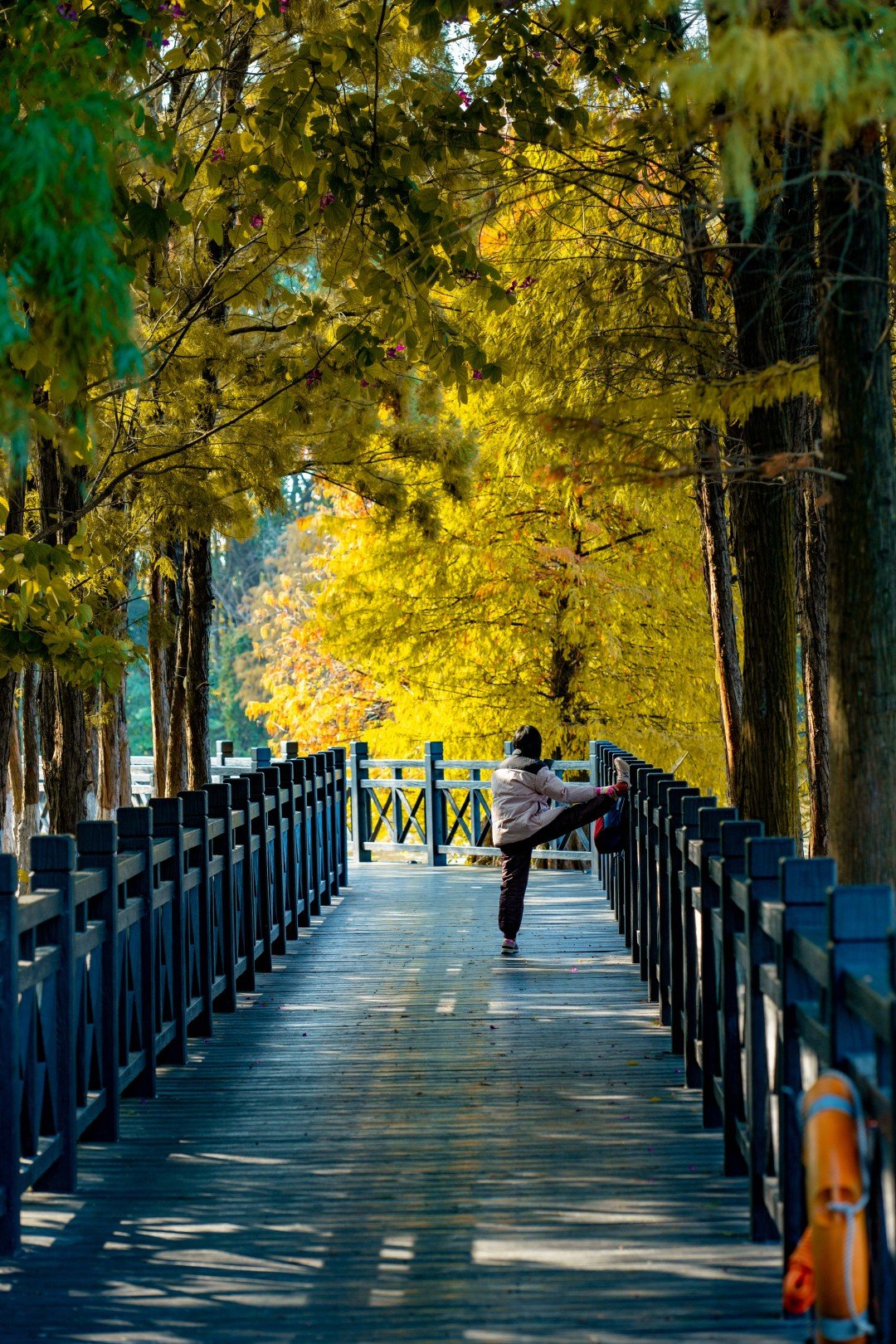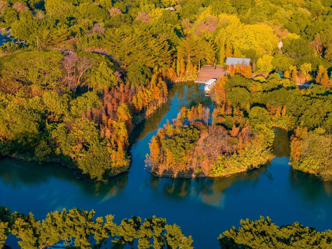 位于湿地一期的友谊林及内河道聚龙湾,则以成排壮观的杉林和静谧的河道景观著称。焦糖色的枝叶垂落水面,阳光透过缝隙洒下斑驳金芒,绿水与红杉相映,营造出宛如童话世界的氛围。此处被许多摄影爱好者誉为“城市秘境”,树干倒映在碧绿水中,色彩浓郁和谐,出片率极高。
