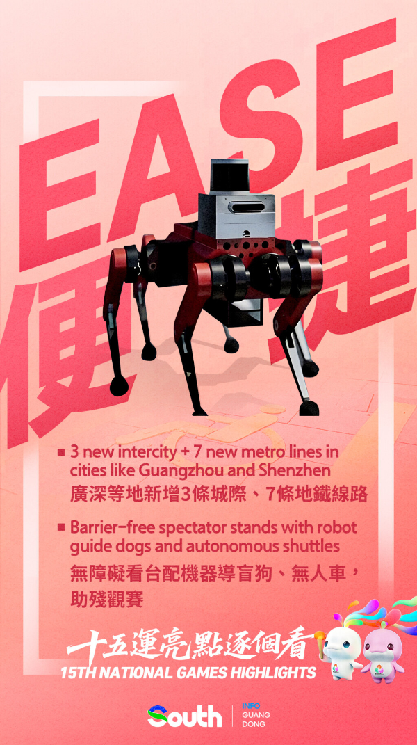 Transportation upgrades are another key focus. A total of 623 roads have been improved or expanded, and three new intercity rail lines and seven metro extensions in Guangzhou, Shenzhen, and other cities are set to open. For attendees with disabilities, the Games will provide smart barrier-free seating, autonomous shuttle buses, and robotic guide dogs.