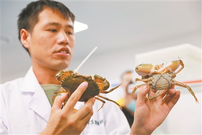 南沙华农渔业研究院研究人员展示南沙青蟹。