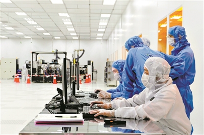 车间内24小时维持无尘状态,恒温恒湿,四季如春,“寸土寸金”。进入无尘车间的人员“武装”到牙齿,洁净服、头套、手套齐备,全身只有眼睛露在外面,再经过长长的通道才能进入车间。邵永华指着通道顶部告诉记者:“通道上空不断向下吹淋高速气流,工作人员经过时,身上微小的尘埃粒子会被吹走,确保进入无尘车间时符合生产的洁净度要求。”