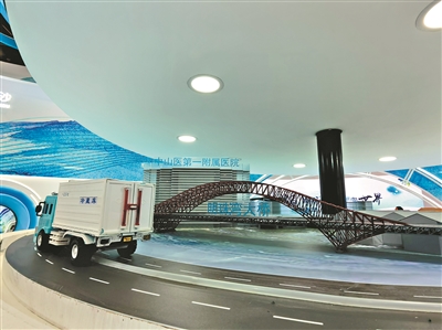 第二层,在最显著的地方耸立着全国最大的“冰箱”—— 广州南沙国际物流中心南区冷链项目。近处,南沙港区码头一派忙碌景象,集装箱堆积如山,各种机械设备加紧搬运货物;远处,数艘万吨巨轮正缓缓消失在地平线上……代表着“海铁联运”的小火车模型在马不停蹄地奔跑。