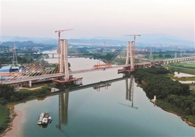 增江特大桥为双塔双索面混凝土斜拉桥,为广汕高铁关键控制性工程。大桥全长2569.480米,桥梁主跨260米,跨越增江水道,主塔采用高100米H形桥塔。主桥在全世界高速铁路斜拉桥建设中首次采用混凝土梁节段预制胶拼法施工,这一创新性技术应用成为国内高速铁路建设的新标杆。