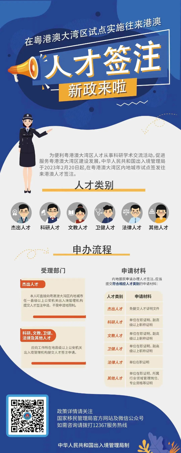 为便利粤港澳大湾区人才从事科研学术交流活动,促进服务粤港澳大湾区建设发展,中华人民共和国出入境管理局决定,自2023年2月20日起在粤港澳大湾区内地城市试点实施往来港澳人才签注政策。现公告如下: