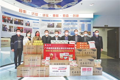 广药集团此次捐助,也是为粤港携手抗疫做出了自己积极贡献。新冠肺炎疫情发生后,广药集团积极承担作为广东省和广州市药品药械和防控物资储备承储单位的职责,坚持“不提价、不停工,保证产品质量、保证公益为上”的“两不两保”承诺,加班生产抗病毒药物,助力建立广州市“穗康”网约口罩渠道,累计捐赠药品、防护物资超3000万元,累计供应各类抗疫物资超1.2亿件。今年,广药集团还携广药白云山和康美药业捐赠了500万元抗疫物资助力西安抗疫,筹集了200万元防疫物资和教育抗疫物资,驰援广东云浮和广西百色。广药旗下白云山和黄中药联合部分连锁药店,仅用两天时间,就筹集了白云山复方板蓝根颗粒、感冒清热颗粒等抗疫物资送往百色。