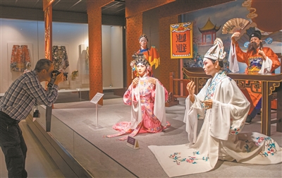 粤剧艺术博物馆的“广福台”上,正好上演《花田错会》《花木兰巡营》等剧目。悠扬的粤声与淅沥的雨声相和,吸引了摄影家和游人驻足。博物馆内丰富精美的粤剧展品,特别是难得一见的华美戏服,吸引摄影家们纷纷按下快门。