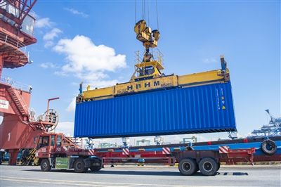 在广州港南沙集装箱码头,装载货物的集装箱正从接驳船上卸下转运。