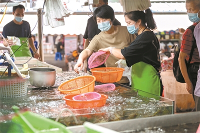 茶滘市场内的水产摊档重现生机,市民在有序购买河鲜海鲜