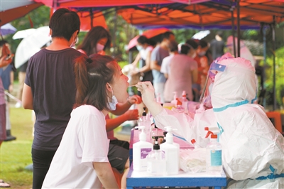 在白鹤洞街曼宁社区曼宁花园采样点,居民们来到小区花园,撑着伞排队等待核酸采样。广医二院支援曼宁花园医疗队成员、医生张实介绍,他们从6月2日起支援曼宁花园的大规模核酸采样工作。疫情之初,这支队伍完成全小区所有的核酸采样任务需要约11个小时,如今只需四五个小时就能做完所有采样工作,甚至还能支援附近小区。