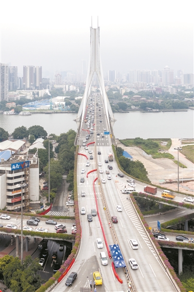 24日鹤洞大桥上双向车流明显增大,车辆有序进出。