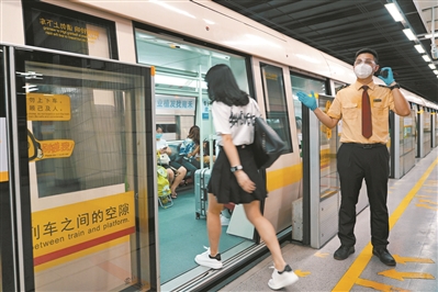 地铁工作人员引导乘客搭上刚复通的地铁。
