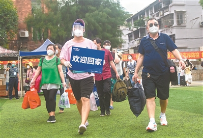 又一批解除隔离的小区居民回到鹤园小区,他们在手举“欢迎回家”引导牌的志愿者带领下来到鹤园足球场集中。