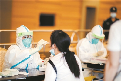 8日,在海珠区南丰朗豪酒店东广场采样点,工作人员为参展参会人员提供核酸检测服务。