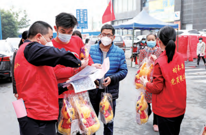 均禾街封控区解封现场,工作人员为居民送上“火龙娃”以示祝贺。