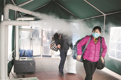 今年广州火车站新引入4个雾化式防疫消毒通道。