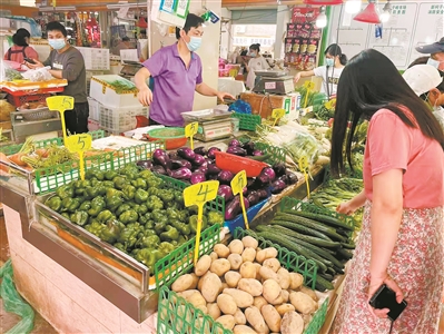 白云区一农贸市场内,物资供应充足,居民理性购买。