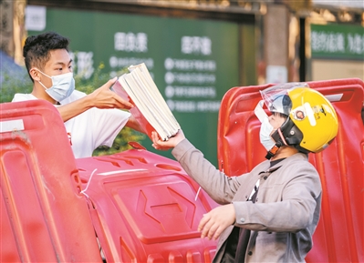 管控区内居民在卡口处取物资。