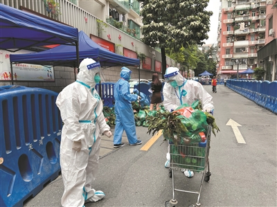 防疫工作人员将蔬果装满购物车推进管控区域。