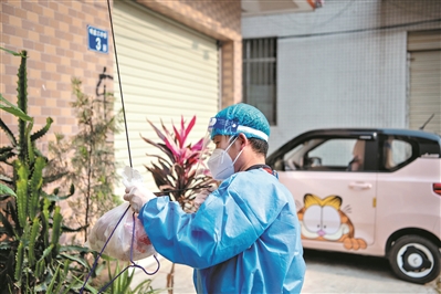 “你好,物资到了,请取物资。”5月5日,广州市白云区人和镇明星村内,一位“大白”志愿者正在给居家隔离居民配送物资。