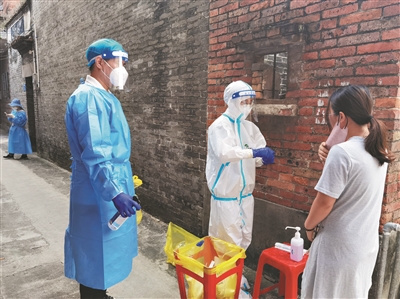7月16日上午9时许,记者在大朗桑下街三巷看到,身着蓝色隔离衣的黄炳权正逐栋上门通知住户下楼进行核酸采样,并提醒他们戴好口罩、间隔1米、减少交流。