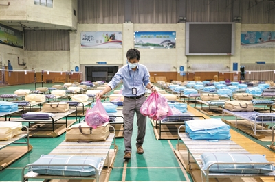 记者现场探访看到,临时安置点设置在健身中心三楼的羽毛球馆,5000多平方米的馆内,几百张床摆得整整齐齐,床上还摆放着被子和枕头。每个入驻的“小哥”还能领取免费“大礼包”,有毛巾牙刷、洗发水、拖鞋等,还提供饮用热水。