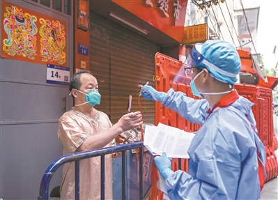 18日上午11时,在家门口完成当天核酸检测采样后,志愿者给黄婆婆递上了网格出入证,跟她讲解用法:“因为周边的一些网格还是高风险区,所以不能跨网格走动,凭出入证和24小时核酸阴性结果,可以在网格内走动,也可以到社区外进行生活必需品的采购。”