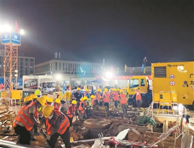 深夜的工地仍然灯火通明,工人将电缆接力传递进施工现场。
