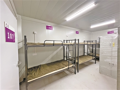 走进即将交付的方舱医院,隔离病房内设有3张上下铺位,被子和毛巾已经准备就绪,空调、储物柜等设施也是一应俱全。院区内除隔离病房外,设有护士站、卫浴区、物资储存区、紧急抢救区,满足入院病患的基本医疗需求和生活需求。经过被称作医护“守护神”的通过区,才是医护人员调整休憩的区域。