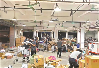 快递数量激增 小哥连续工作及时送件