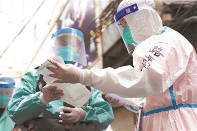 上午9时左右,来自越秀集团的网格员爬楼梯挨家挨户敲门,核实居民身份,发放一张政府赠送的价值300元的购物卡,嘱咐他们收拾行李、穿好防护服下楼按指引排队等候。
