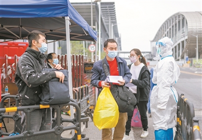 11日下午,琶洲方舱医院出口处,不少达到出舱条件的感染者拎着行李离舱