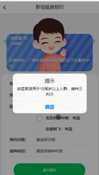 注意:未满18岁,不能预约安徽智飞新冠疫苗,系统则会提示您不符合要求。