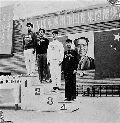 钟南山(左四)参加1954年广州市田径、集体体操运动大会,获四百米项目第四名。