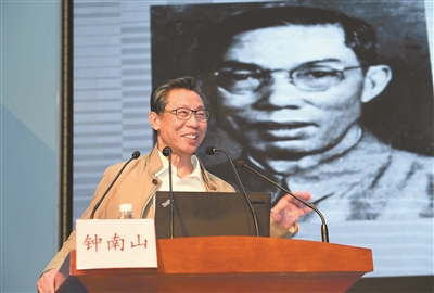2016年12月3日,省人民医院建院70周年,医院邀请钟南山院士作报告。背后是他的父亲钟世藩的照片。