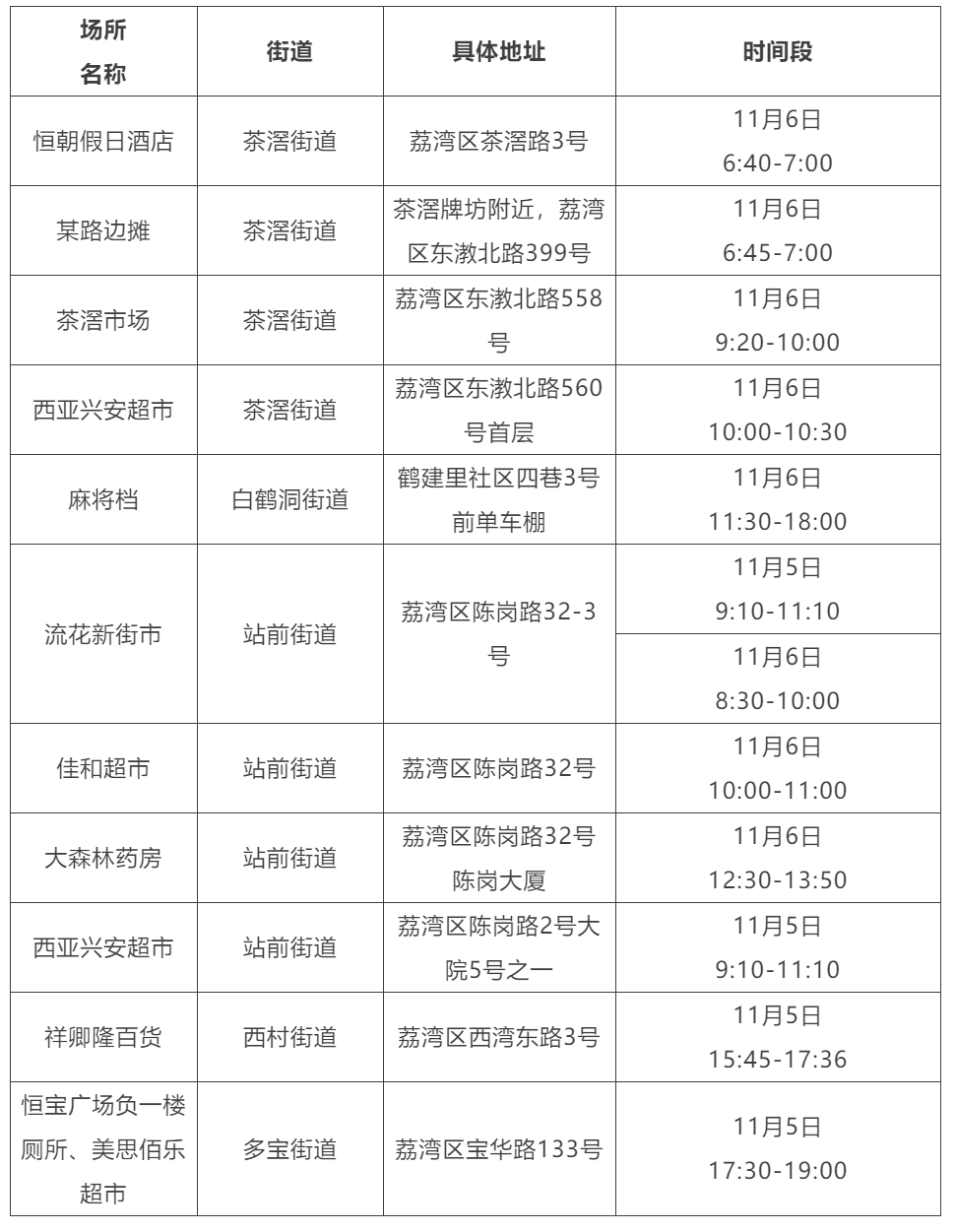 因疫情防控需要,请在相关时段到过荔湾区下述重点场所的人员,立即向所在社区联系报备,开展“三天三检”自我健康监测,期间非必要不外出、不聚集、不聚餐、不乘坐公共交通工具,同时按照社区和疾控部门的要求配合做好健康管理。重点场所名单后续将按实际情况更新。