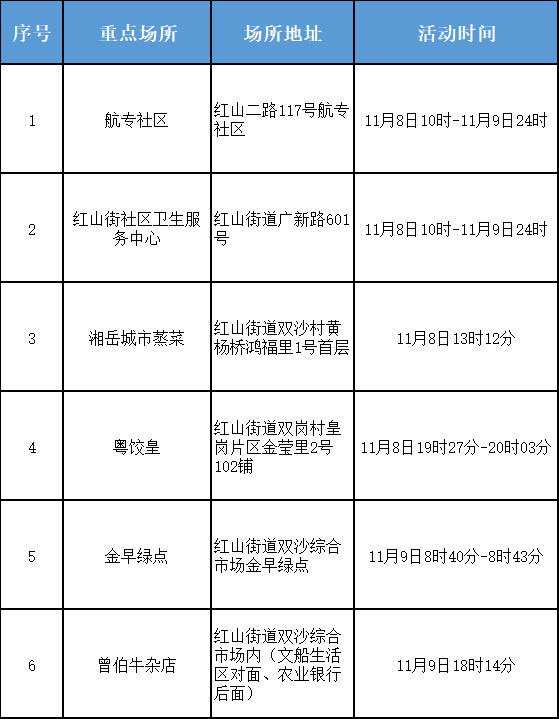 11月10日,黄埔区红山街道在重点人群筛查中发现1例核酸检测异常人员,经初步流调核实,涉及我区重点场所6处(详见附表),黄埔区新冠肺炎疫情防控指挥部已立即启动应急响应,组织开展了区域管控、流调排查、核酸筛查、转运隔离、场所消杀等工作。