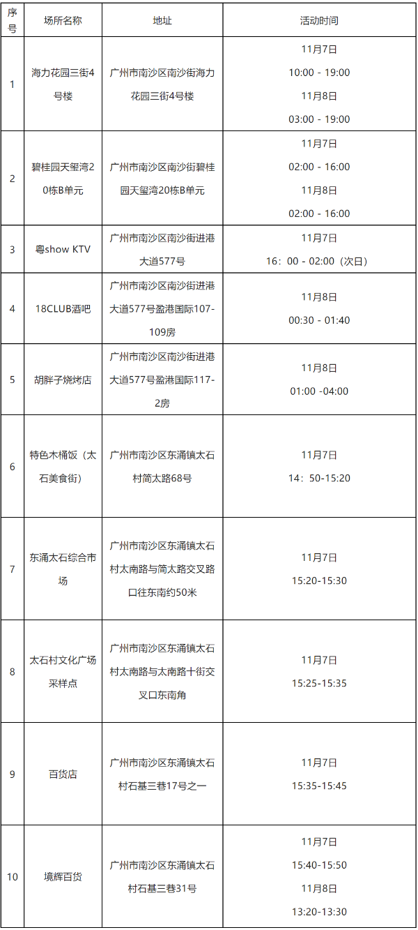 因新冠疫情防控需要,请在相关时段到过南沙区下述重点场所的人员,立即向所在社区(村居)联系报备,严格落实“3天3检”,并配合做好疫情防控各项措施。若不如实申报,不落实防控措施,造成严重后果的,将承担相应法律责任。