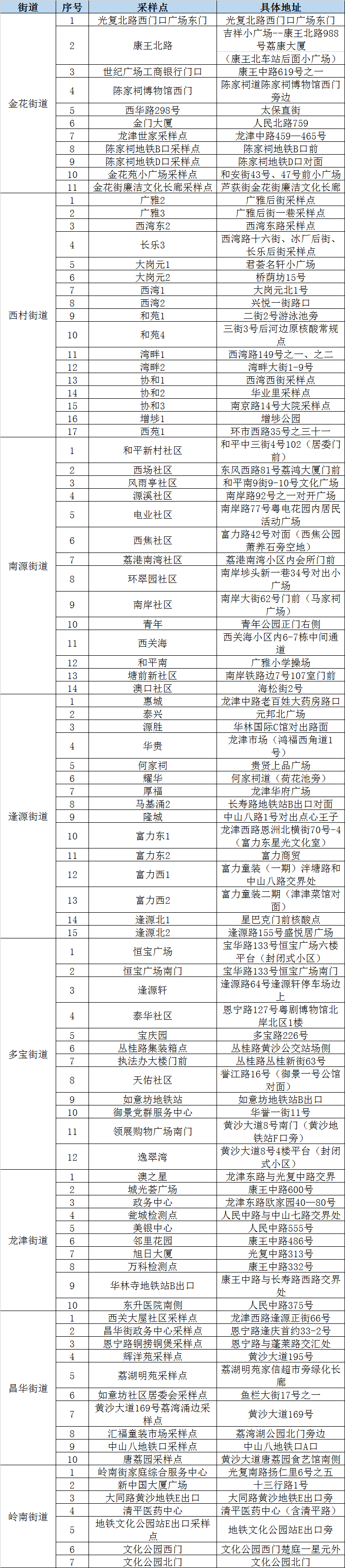 根据最新疫情防控形势,为切实保障广大市民生命安全和身体健康,我区定于2022年11月21日(星期一)开展核酸检测“应检尽检”工作,早上7时开始。请荔湾辖区内全体市民(含外来人员)到就近的采样点(详见附表)进行1次核酸检测。有关注意事项如下: