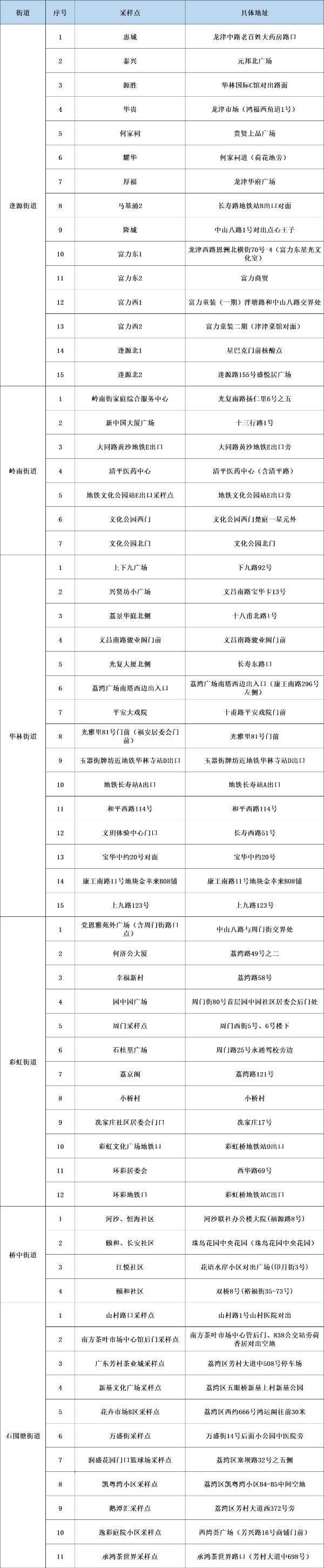根据最新疫情防控形势,为切实保障广大市民生命安全和身体健康,2022年11月28日(星期一)8时开始,逢源、岭南、华林、彩虹、桥中、石围塘、茶滘、白鹤洞、东沙、海龙等10条街道开展核酸检测“应检尽检”工作,请以上10条街道的市民朋友(含外来人员)到就近的采样点(详见附表)进行1次核酸检测。有关注意事项如下: