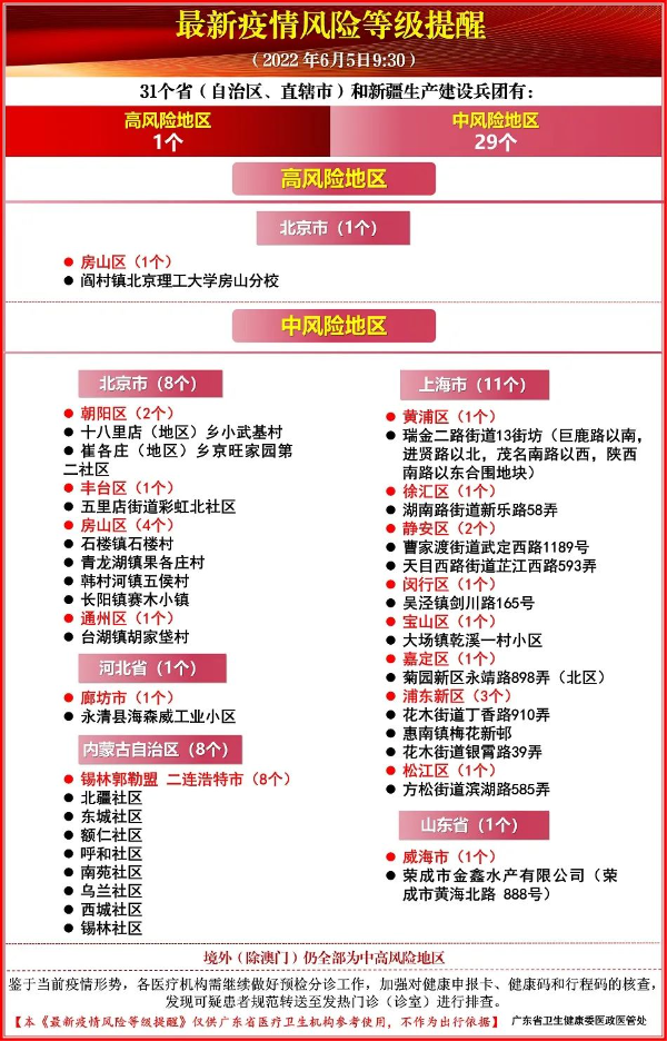 最新疫情风险等级提醒(截至6月5日9:30)详细风险区查询可...