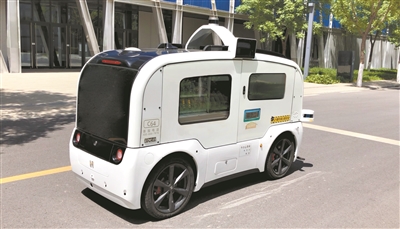 无人售货车、无人扫地车、无人快递车的投入使用,让雄安更具“未来之城”的气质。图为无人售货车。