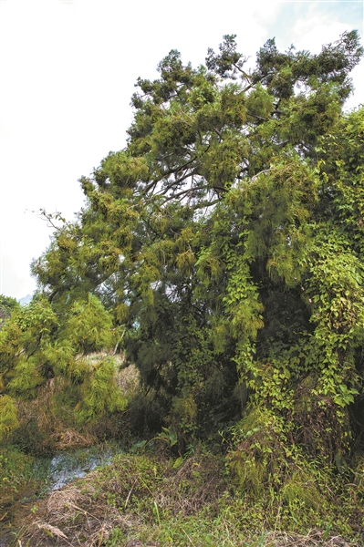走近一看,只见藤蔓植物依附在“水松王”上,与水松枝叶一同垂落到地面上。拨开重重枝叶,记者才看到了藏身其中的水松树干。
