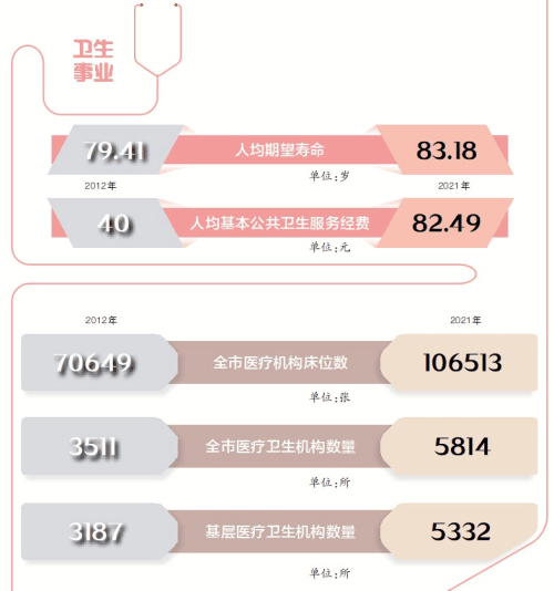 党的十八大以来,广州市卫生健康事业获得长足发展,居民人均预期寿命从2012年的79.41岁提高至2021年的83.18岁,主要健康指标基本达到发达国家水平。