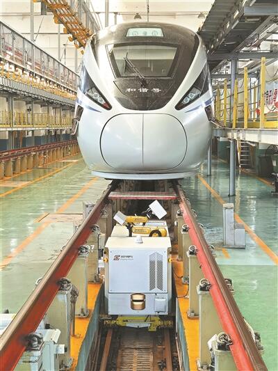松兴电气动车车底检测机器人正在为和谐号进行检修。