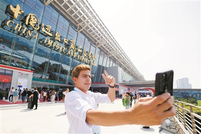 广交会首日,一位来自南美洲的外商在展馆外自拍