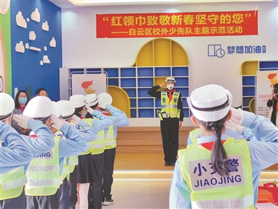 在“红领巾致敬新春坚守的您”主题实践活动中,少先队员向春节期间坚守岗位的公安干警等行业代表送上新春祝福