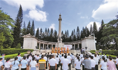 9月2日10时,伴随着雄壮的国歌声,纪念活动正式开始。来自广州市天河区龙岗路小学的同学们朗诵了诗歌《不朽》,表达对抗战英雄的无比崇敬之情。紧接着,献花仪式开始,全体人员庄严肃立,向先烈鞠躬致敬,各单位代表在先烈纪念碑前依次向抗战先烈敬献花篮。