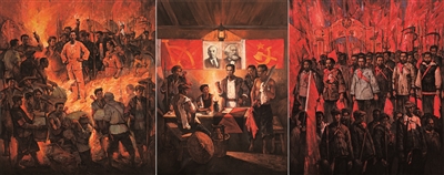 《唤起工农千百万——彭湃与海陆丰农民运动》以三联画的艺术形式,生动再现中国农民运动先驱彭湃及其领导的海陆丰农民运动,每一联都有特定内容和叙事情节,形成恢宏壮阔的历史叙事。其中,该画作左联还原的便是“彭湃烧田契”一幕,这是中国共产党领导的早期农民运动中的著名场景。通过实践,彭湃与农民运动先驱们为全国农民运动打下了基础。