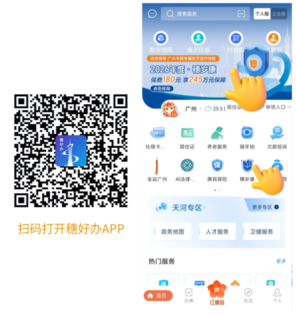 扫描下方二维码打开穗好办APP,点击首页轮播图或首页“穗岁康”图标即可进入参保页面。